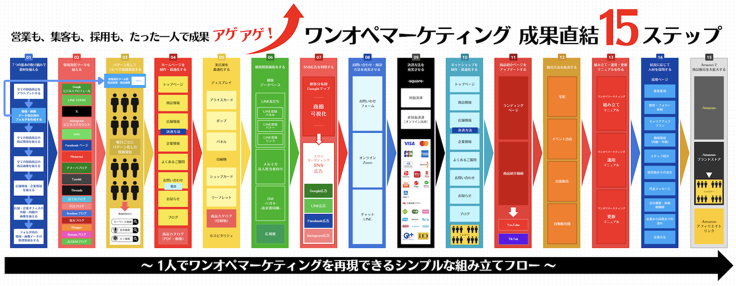 全て1人で対応することができる営業・集客・採用をコピペ情報発信に一本化した“超合理的”なマーケティングメソッド「ワンオペマーケティング」の「全体導線マップ」の導線を作るための「ワンオペマーケティング – 成果直結!組み立て 15ステップ -」です。1ステップずつの取り組みを全て明記しています。このステップ通りに仕組みを組み立てると営業・集客・採用の成果は、日々の情報発信だけで確実に”アゲアゲ”になります。