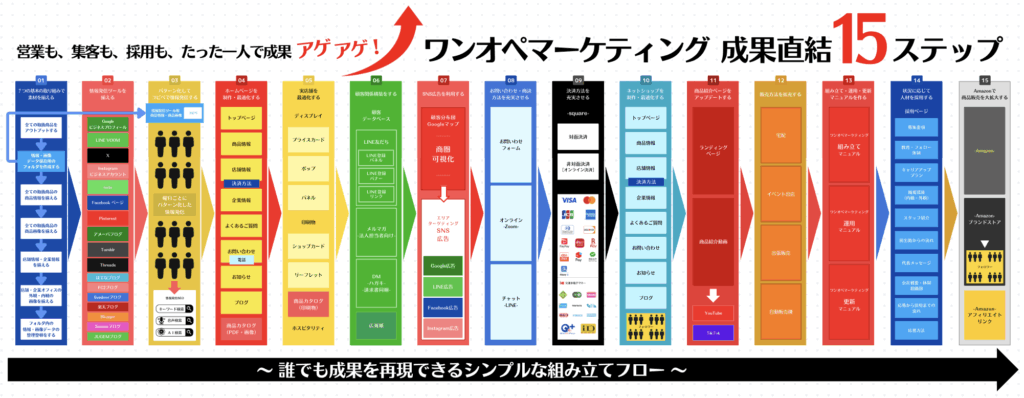 誰でも成果を再現できるシンプルな組み立てフロー「ワンオペマーケティング 成果直結 15ステップ 」に沿って仕組みを組み立てれば、 コピペ情報発信の成果と効果は MAXに!