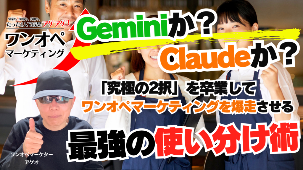 Googleのエコシステムと完全に一体化し、みなさんの「バックヤード」を縦横無尽に駆け巡るGemini。そして、繊細な表現力と膨大な資料整理において右に出る者がいないClaude。この2つの巨頭を「ワンオペマーケティング 成果直結!組み立て 16ステップ」の中でどう組み合わせれば、最も「簡単・楽に・スマート」に成果を出せるのか。