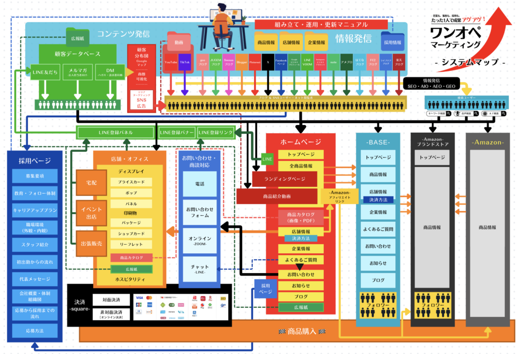 全て1人で対応することができる営業・集客・採用をコピペ情報発信に一本化した“超合理的”なマーケティングメソッド「ワンオペマーケティング」の全体像を見える化した「ワンオペマーケティング システムマップ」です。日々の情報発信が様々なマーケティングツールに連動して、営業・集客・採用の成果に直結します。